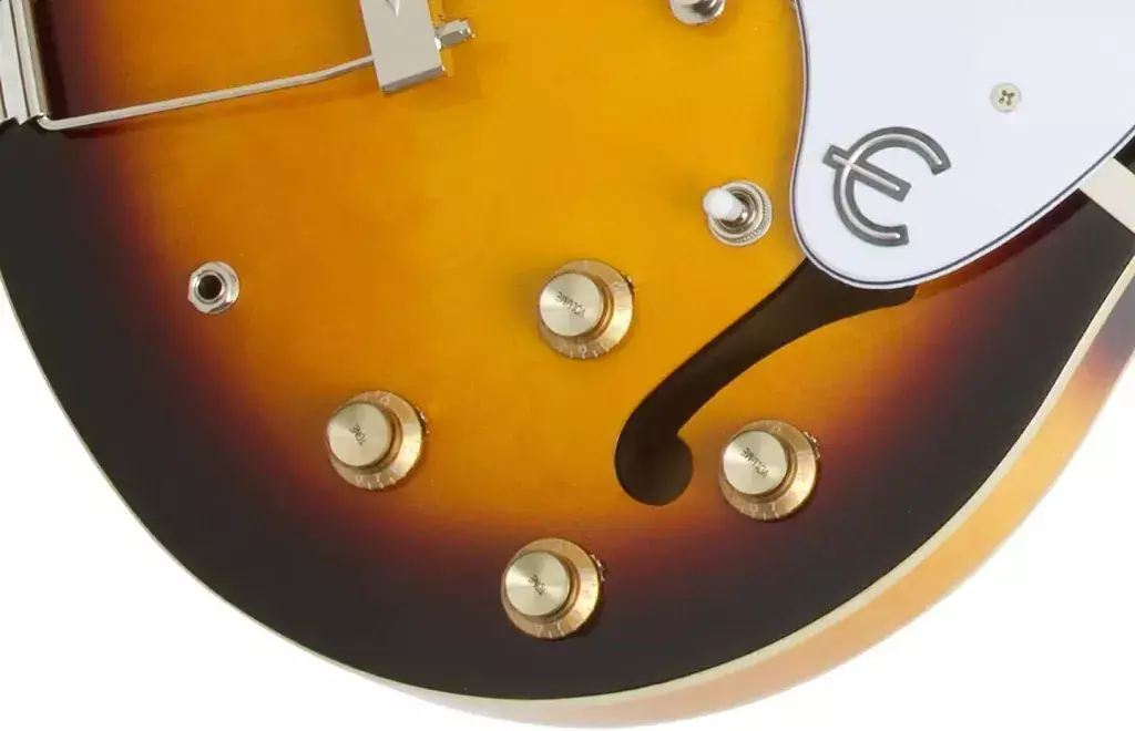 La guitarra eléctrica Epiphone Casino en un acabado Vintage Sunburst. Este modelo es icónico por su diseño de cuerpo completamente hueco (hollowbody) y su asociación con músicos legendarios como los Beatles, Paul Weller y Noel Gallagher