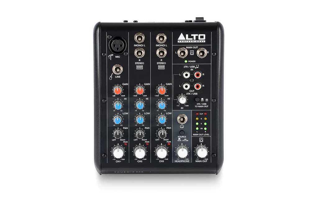 El Alto Professional TrueMix 500 es un mezclador portátil con una interfaz de audio USB estéreo integrada que ofrece todas las funciones esenciales que necesitas para grabaciones en casa, transmisiones en vivo, podcasts o presentaciones. Cuenta con cinco entradas analógicas con circuitos de alto margen, lo que minimiza el ruido y la distorsión en la señal. El canal de entrada de micrófono ofrece una entrada XLR, ideal para conectar un micrófono dinámico. Este canal también tiene una entrada de línea balanceada de ¼” para conectar instrumentos y otras señales de nivel de línea. Además, hay dos canales de entrada estéreo, cada uno con entradas TRS balanceadas duales de ¼”, perfectas para tus fuentes de audio de nivel de línea.